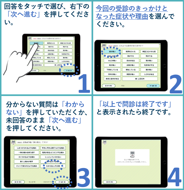 画面から回答を選んでタッチしていくだけで簡単に問診が終了します。