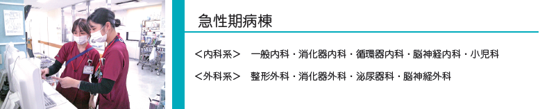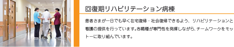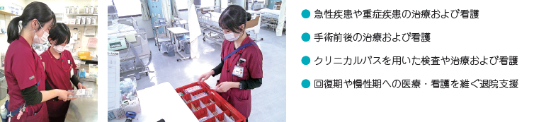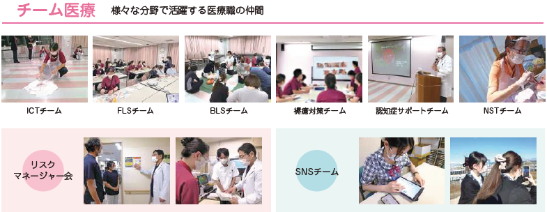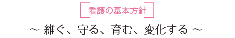 当院は急性期治療から回復期の医療を一つの病院で展開できるケアミックス病院です。4つの基本方針を掲げ、様々な特徴をもつ病棟の機能や、他職種間を維いで患者さまの安全と生活を守る。そして、豊かな人間性をもった医療人であるよう育みあい、日々研鑽を重ねて自己を進化させていく、そんな看護部でありたいと願っています。 |