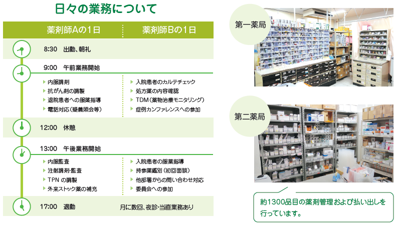 現在、12名(常勤11名、非常勤1名)の薬剤師、薬剤助手2名で業務を行っています。