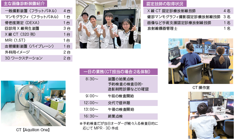 画像診断に関わる技師が協力し技術向上に努めています。マンモグラフィ認定技師・CT認定技師を取得している診療放射線技師も多数在籍し、認定技師取得を希望の方には支援を行っています。